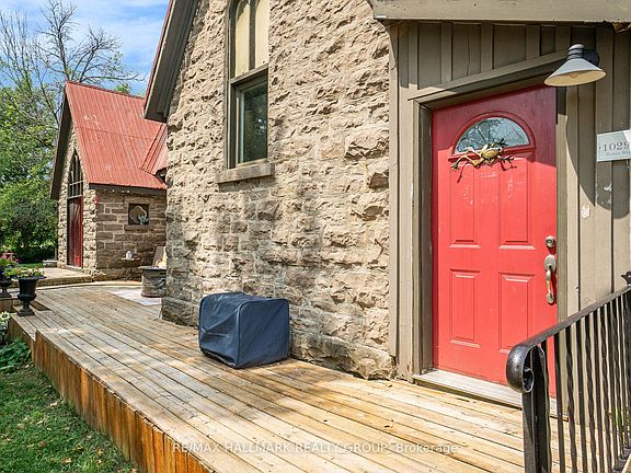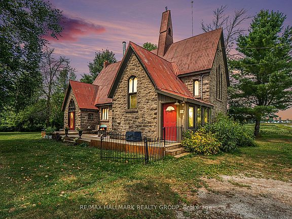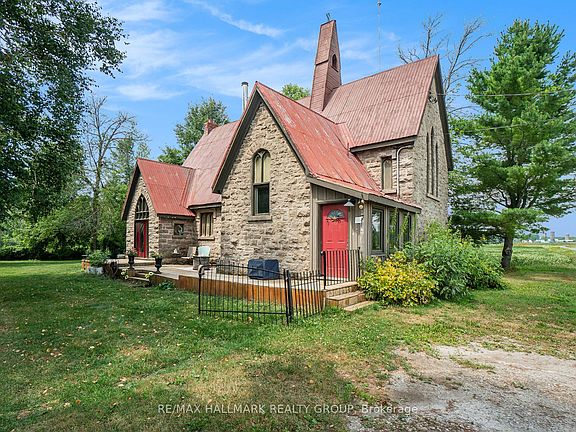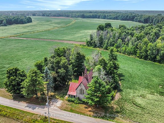 Welcome to 10290 Redan Road Nestled between Brockville and Smiths Falls on a beautifully private half-acre lot, this awe-inspiring, 1-of-a-kind property is a masterful blend of historic character and thoughtful modern updates. Originally built in 1893, this breathtaking limestone church has been lovingly restored and reimagined into a truly unique residence. The charm of this former church captivatesits stately limestone exterior, steeply pitched rooflines, and iconic pointed-arch windows evoke a timeless beauty rarely found in todays homes. Inside, the space opens dramatically into a stunning two-storey great room with soaring cathedral-style oak ceilings, exposed woodwork, and gleaming refinished original hardwood floors. Natural light pours through the exquisite stained glass windows, creating a warm and inspiring atmosphere throughout.The main level offers an updated kitchen (2016) with stainless steel appliances (2020), ample cabinetry, and a cozy eating area. Just off the kitchen is the conveniently located laundry, tucked into the renovated full bathroom. You'll love curling up by the pellet stove, taking in the serene views and peaceful ambiance this special home provides.Upstairs, the open-concept loft offers incredible versatility. It currently features one large bedroom with vaulted ceilings and overlooks the main living space. A second bedroom is already in place, and theres flexibility to easily create a third if desiredperfect for families, guests, or a home office.Modern comforts haven't been forgotten: a high-efficiency propane furnace and central A/C were installed in 2016, and a tankless water heater (2020) ensures you'll never run out of hot water. Whether you're searching for a tranquil weekend retreat, an inspiring artist's studio, or a unique forever home, this property is truly unlike anything else on the market.Dont miss your chance to own a piece of history with soul, character, and modern livability. Schedule your private showing today