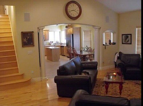 This house was built in 2005 and is like new. It is in North Utah County near American Fork Canyon in a private upscale neighborhood named Wild Rose. It has walking trails, a neighborhood park and an apple orchard that is free to everyone in the neighborhood. It is at the end of the road so there is no traffic in front of the house. The schools are all in Alpine School district and among the best in the nation. All houses in Wild Rose have a minimum of 30% Brick or Rock, and the rest Stucco. The house has vaulted ceilings in every room, including the bedrooms. It has Maple Hardwood Flooring throughout the whole house except the kitchen and bathrooms where it has the large tiles. There is surround sound in the living room, kitchen and even out on the deck. It has a gas fireplace in the living room and even in the master bedroom. The master shower is large, with two shower heads and two corner benches in the shower. It has a jetted tub and a large walk in closet. All the inside walls are insulated for a sound barrier so the bedrooms are very quiet. The main level has 3 bathrooms, 4 bedrooms and one bedroom has a sink. The kitchen has all Maple Cabinets and two sinks and Double Ovens. The basement is finished and has 3 bedrooms and 1 bathroom and a kitchen as well. It has 9 foot ceilings and a separate outside entrance for the downstairs. In total, the house has 7 bedrooms, 4 bathrooms, 2 kitchens, 2 laundry rooms and a large food storage room. It has a large Trex Deck that connects to a large cement patio with speakers over head to listen to your music. The basement is sealed off with a solid door & dead bolt. We rent the basement for extra income. The house also has Solar panels on the roof.