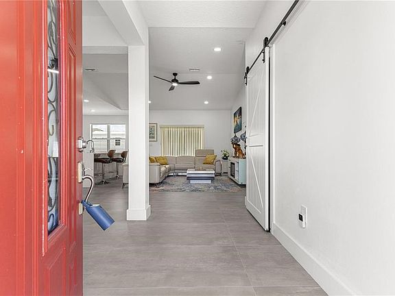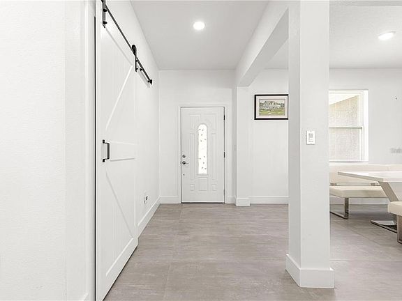 Welcome to this stunning 2022-built home featuring an open floor plan with 10-foot ceilings with recessed lighting throughout and a vaulted ceiling in the living room, creating a spacious and airy feel. Located on a desirable corner lot, this property is fully enclosed with a vinyl privacy fence and offers a blank slate for landscaping, ready for your personal touch. Imagine putting in a beautiful pool and fire pit in the back yard giving you your own private oasis!Step inside to elegant porcelain rectangular gray tile flooring with minimal grout lines throughout the entire home. The gourmet kitchen boasts quartz countertops and center island with breakfast bar, dark gray cabinetry, bi-fold barn door on the pantry, wine refrigerator, marble backsplash and stainless steel appliances-perfect for both everyday living and entertaining. The master suite offers a luxurious retreat with a slipper bathtub, walk-in shower, and dual sink vanity. 2 guest bedrooms and a full guest bathroom with shower/tub combo available for your family or guests. Custom touches like multiple barn doors offer a stylish, modern flair. Other features include inside laundry, all furniture included-truly move-in ready and a 2-car garage with finished floor and utility sink. Don't miss this opportunity to rent a beautifully designed, turnkey home with premium finishes in every room! This home is close to The Villages and Ocala. Lake Weir is just minutes away as well.