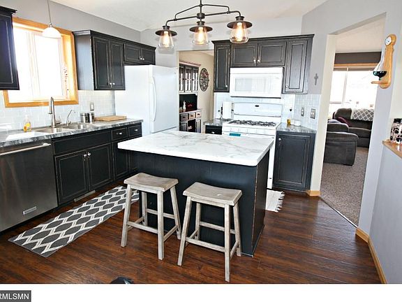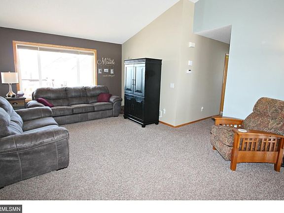Sunny home filled with lots of natural light! Living Room has vaulted ceiling, newer carpet, & oversized windows. Good-size Kitchen with lots of cabinetry, center island, glass backsplash, & room for Eat-in area. Master Suite with private bath & plenty of closet space. Three bedrooms on same level. Large walkout Family Room with stone gas fireplace, slate bar with mini-fridge, surround sound speakers, & slider to covered patio. Huge corner lot - fully fenced in back. Ins. garage too!