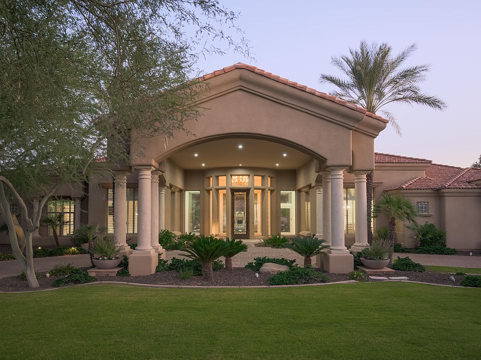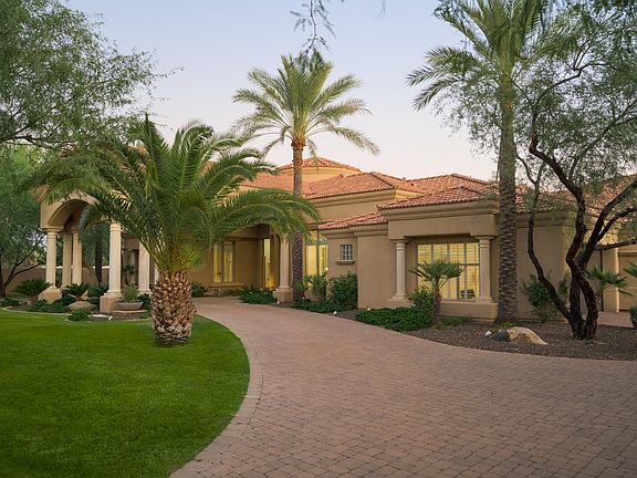 Welcome to resort style living in gorgeous North Scottsdale! This 6000+ square foot Custom Home has everything the most discerning buyer could ask for. Pictures don't do this lovingly cared for home justice! Walking up to the home your view of the resort like pool and backyard through the front door is astounding. Halls adorned with glass welcome you though the entryway and into the meticulously maintained open Kitchen space appointed with Dacor appliances, double oven and built in full size fridge and freezer separates. The Open Great Room concept includes the kitchen, a large living area with built in cabinets and dining banquet. The secondary end of the home includes 3 en suite bedrooms and a large laundry. The opposite, Master bedroom wing .. of the home is accompanied by an office, hobby room and an additional en suite bedroom. The Master Bedroom is highlighted by a wet bar with fridge, sitting area with fireplace, large french doors leading to the back patio. The large Master Bath includes a large soaking tub, separate shower, dual separate vanities and toilet closets as well as a large closet. The backyard resembles a resort, with a gorgeous palm tree lined pool, large gazebo with fireplace, putting green, sport court and play area as well as a large grass lawn. This phenomenal home has it all!