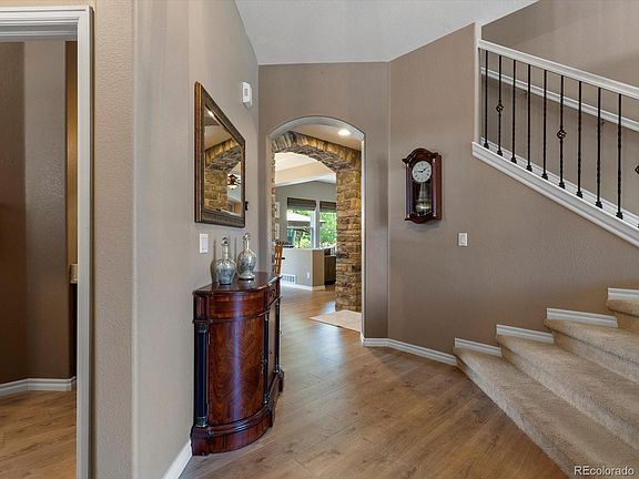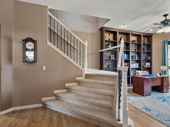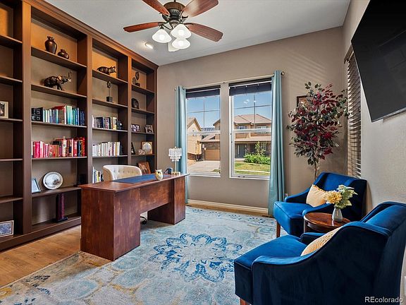 Welcome to your dream home in the vibrant Reunion community. Step inside to discover a tranquil sitting room, library or office with floor to ceiling built in bookshelves. The heart of the home boasting 10 ft ceilings, lies in the back where an expansive open-concept kitchen, dining and living room await. The kitchen is perfect for entertaining and boasts stainless steel appliances, both granite and butcher block counters, large pantry and kitchen island all accented by relaxing neutral colors. Newer luxury vinyl floors flow throughout the main level. An oversized family room with a gas fireplace is perfect to gather. The main floor is finished off with a half bath. Take your entertaining outside to the fully fenced backyard with a large patio, mature landscaping, plenty of grass to play on and don't miss the tranquil area with built-in TV under the gazebo. Upstairs you'll find a serene primary suite complete with a walk in closet, your personal retreat. The soaking tub is a perfect place to relax with a good book. Dual vanities in the primary bath. Two additional spacious bedrooms, an open loft, a full bathroom and a well appointed laundry room complete the upstairs. Don't miss the finished basement with more room to entertain complete with a large family room, game room or dining area, a kitchenette and wine room, full bathroom and an oversized bedroom. This basement provides for potential multi-gen living. Attached two car garage. This home has upgrades and customization throughout including a completely new HVAC system (2023), newer vinyl flooring (2020), newer roof (2019), water softener, and a whole home humidifier. 2x6 construction and meticulously cared for by original owner. Easy access to DIA, E470, Hwy 85 and I76. Living in Reunion means more than just owning a home; it's about enjoying a lifestyle with two community pools, parks, multiple schools, lakes and trails galore, a well appointed rec center, a tennis/pickleball court and countless activities!