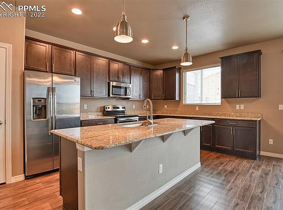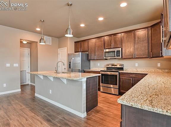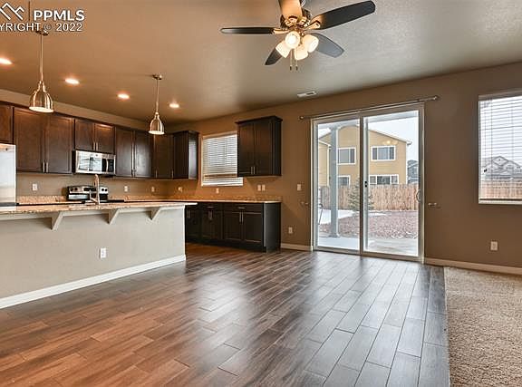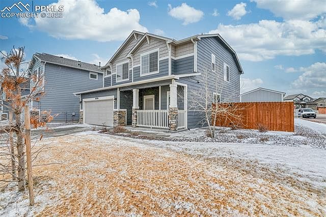Beautiful 2 story home on corner lot that looks brand new. Office /Study is on the main floor with french doors. Large open kitchen with upgraded cabinets, granite counter tops and stainless steel appliances. Large pantry and an amazing granite island. Upgraded tile in the entry and kitchen/dining area. (looks like elegant hardwood) Family room with gas fireplace that has a walkout to back yard. Loft area on upper floor can be a second family room or entertainment area. Large master bedroom with attached bathroom with granite counter tops and flooring. Two additional bedrooms, upstairs laundry and a full bath. Home has air conditioning. Golf course community with a wonderful community center. Close to shopping, restaurants and schools. Easy drive to both Peterson Air Force base and Air Force Academy.