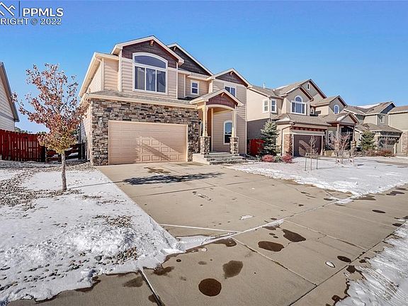 Welcome home to this beautiful former MODEL HOME in Meridian Ranch within walking distance of local schools, walking trails, golf course, recreation center and parks. At the front of the home, you are greeted by a tile foyer, with your choice of a formal dining room, parlor, formal living room, or office with wood flooring, and butler's pantry. The open spacious kitchen has many upgrades including granite countertops, a large center island with double sinks, dishwasher and breakfast bar, upgraded stainless steel appliances, double convection oven, lots of storage and cabinets, and a spacious pantry. The kitchen is open to the dining room and the great room that has cathedral ceilings, gas fireplace with stone surround, and huge picture windows that let in loads of natural light. Powder room is also on the main level. Upstairs you will find the large primary bedroom with two-sided fireplace that can also be seen from the soaker tub. The 5-piece primary bathroom also has large walk-in tile shower, private toilet, double vanity and an attached walk-in closet. The upper level is finished out with two additional large bedrooms, a full bathroom, a loft area and upper-level laundry room (washer and dryer included!). The basement is a perfect place for entertaining or relaxing with over 9 ft. ceilings. The large living area has a built in wet bar with sink, mini-fridge, and microwave. The ping pong table is included! There is another bedroom and full bathroom in the basement. The outdoor area is a perfect retreat with 4-person hot tub, covered patio, gazebo complete with retractable privacy screens and outdoor lighting, grass area and separate fenced area for garden or a dog run. This home comes with solar panels that will be paid off at closing for you to enjoy low cost to no cost energy in your new home! Conveniently located near schools, shopping, restaurants and easy access to Highway 24, 21, and 83 as well as Peterson and Schriever Air Force Bases.