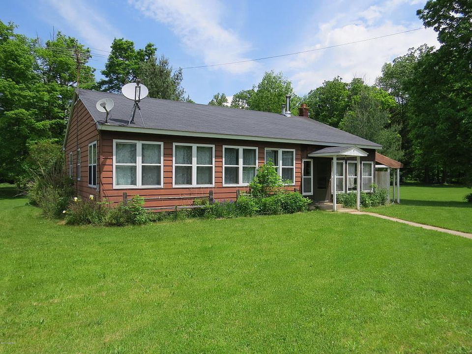 2 - 3 bedroom rancher on just over an acre. Large master bedroom with double closets. 2nd bedroom has sliders out to private deck which would be great for a hot tub. Large utility room with 1/2 bath and laundry. The sellers replaced the wood stove attachment to the furnace in 2014. This was their primary heat source. The home has a large 3 season porch and a covered porch area out the back that is used to store firewood. Nice sized yard with decorative pond. Large pole barn is set up for woodstove heat and has a small office area.