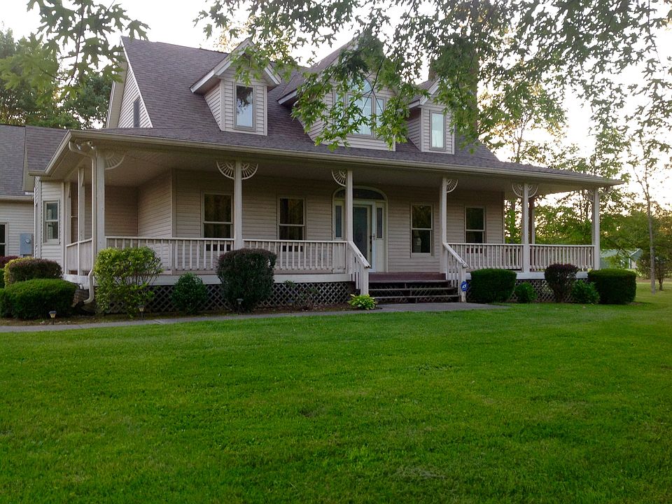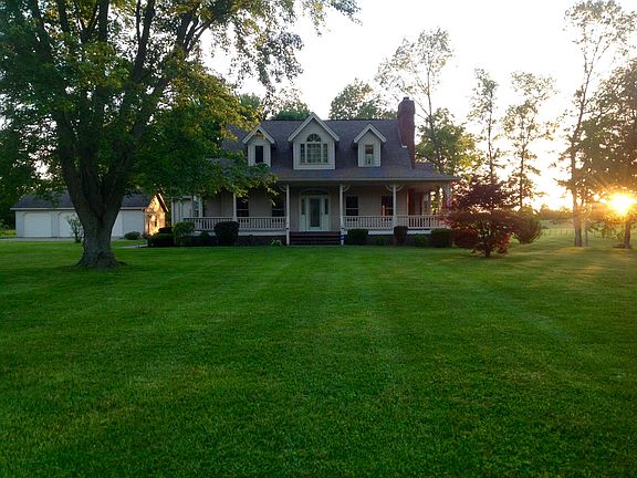 Custom built Cape Cod home on 6.19 acres, 2540 square feet, 3 bedrooms, 2 1/2 baths. Offers a formal dining room with French doors, bay window, and a 2 story foyer; Hardwood, carpet, and ceramic flooring; Living room with fireplace; Walk-in closets; Bonus room above attached garage; Large deck on back; 2 car attached garage & 3 car detached garage; 36 x 36 horse barn with stalls and loft. Conveniently located close to I-70.