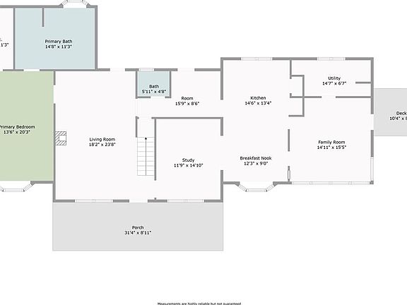 The two-story layout is as follows - Downstairs: A master bedroom, a living room with a wood-burning stove, a study, a large eat-in kitchen, a half bath, a huge laundry room, a flex space off the kitchen that could be used as a formal dining room or additional living area, and a small mudroom space off the back door.