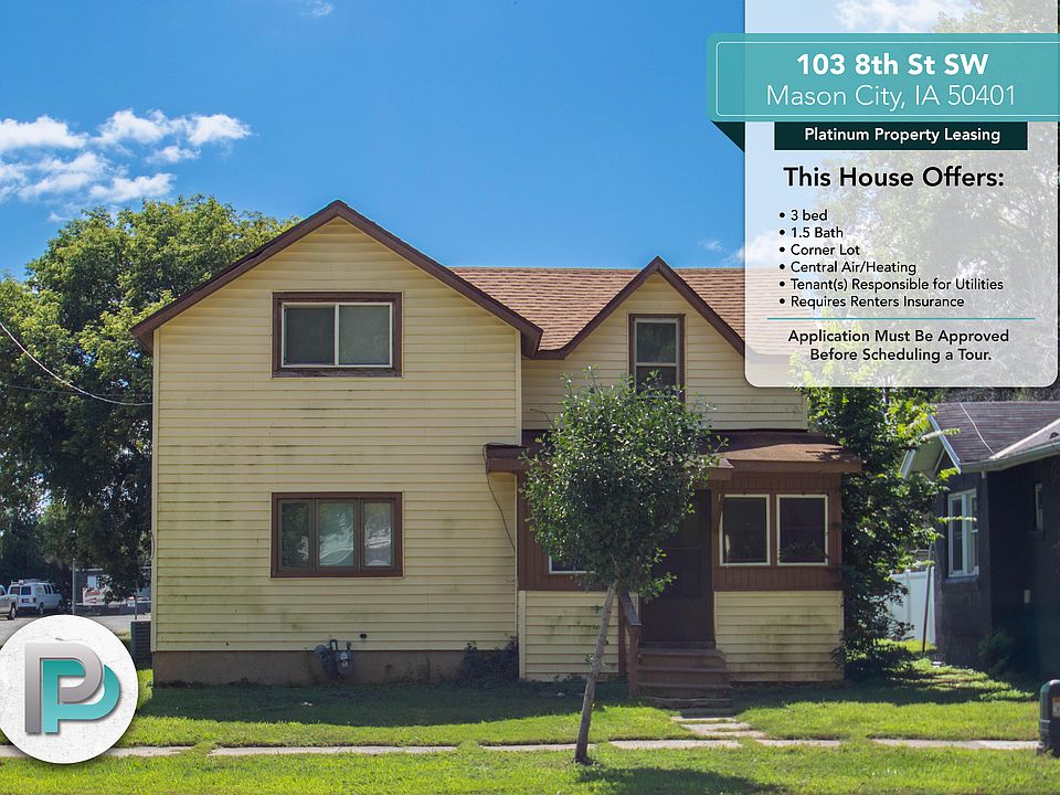 Platinum Property Leasing 1002 E State St NW STE A Mason City, IA 50401 - ACTIVE RENTAL - Welcome to this comfortable and well appointed split level home located at 103 8th St SW in Mason City. Nestled on a corner lot, the residence offers a thoughtful layout spanning approximately 1,165 square feet and features 3 bedrooms and 1.5 bathrooms. Prior to any showings, applications must be submitted on Platinum's website to qualify. This split-level corner lot home offers an open-concept main floor with updated laminate flooring for easy cleaning. The layout includes a dedicated dining area, a comfortable living room, and a main-floor bedroom with a private bathroom with a walk-in shower. Upstairs, an open landing leads to a second bedroom with a spacious open closet, and a second bathroom is conveniently located between next to the third sleeping areas. Tenants are responsible for all utilities, including lawn care and snow removal. A Pet will be considered in the future. As part of the application process, please be prepared to provide two months' worth of proof of income. Future tenants will be required to maintain renters insurance throughout your entire occupancy. Your Earning statement(s) need to include - Employer or Company Name - The Account Name - Pay period (Current Year) - 1 yr lease term - Renters Insurance required - Pets will be considered $50/MO per pet. - No smoking allowed in the house. Applications are only accepted through our website: Platinum Property Leasing .com We do NOT accept application through: -Zillow -Google - Facebook - Instagram - any social media outlets