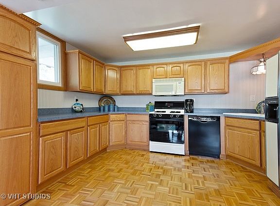 Raised ranch with parquet floors throughout the kitchen and dining room. Beautiful bay window in dining area lets in lots of natural light. Solid oak cabinets in the kitchen. Nice deck off the living room looks out into the backyard. Another big bay window in the living room as well. Heated workshop and heated 2 car garage.