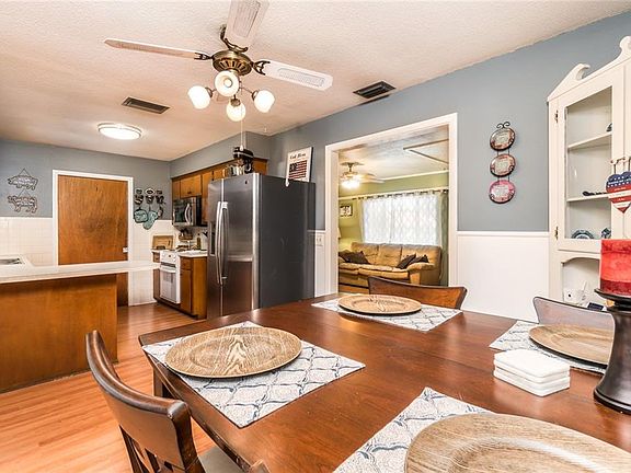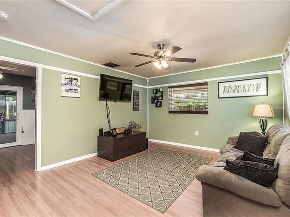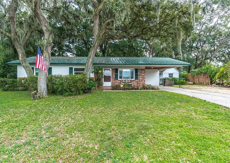 This adorable 3 bedroom 2 bath homes sits on just over a quarter of an acre of land and is cute as a button! The lot features beautiful trees and a fully fenced large back yard with several out buildings for storage plus a carport with extra space for parking to the side. The brick exterior and green metal roof add to the wonderful curb appeal including the adorable front porch! Inside you will find a very functional floor plan with some recent improvements including newer windows and slider (2017 energy efficient), plus newer AC (2015) and well (new pipes, pump and tank in 2018). The large screened lanai is the perfect place to relax and entertain.
