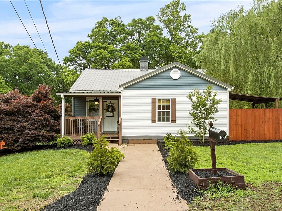 Welcome to 103 Arlington Avenue! This 2 bedroom, 2 bathroom home located in the City of Easley is move-in ready with all appliances included!This recently renovated house has an updated eat-in kitchen with granite countertops & stainless steel appliances. Laminate flooring throughout living room & kitchen with carpet in the two bedrooms. Both bathrooms recently updated--private primary with shower and secondary bathroom with tub/shower. Unfinished basement with 1 car garage could function as storage room, project room, or workout space! Enjoy the mild upstate seasons on the covered front porch or in the private side yard complete with additional covered space and a relaxing swing. Fully fenced backyard with 6' wood privacy fence. Driveway gate leads to ample parking on oversized backyard parking pad. Schedule your showing today!
