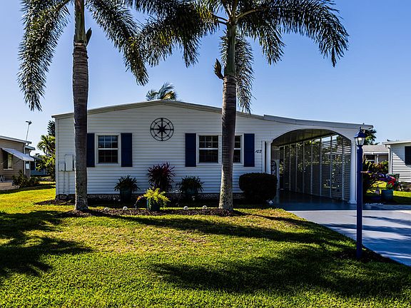 Beautifully remodeled lakefront, with two bedrooms, a den with a closet, a full-size washer and dryer, a sunroom, and fantastic outdoor living, this manufactured home is truly exceptional. The lovely 23-ft. living room offers diagonal ceramic tile flooring, French doors leading to the sunroom, and peaceful lake views. Relax outside in your zen-like yard with picturesque views of the lake. Enjoy the fire pit with your family. Let's remember to mention the outdoor built-in BBQ and a custom-built insulated/air-conditioned outdoor storage/workshop—with its own sink and granite counters! This home will satisfy. An additional highlight is the attached 45-ft. long carport, which can accommodate a large boat or camper. Riverwood Estates is a 55-plus community, and property owners have ownership of the land, low HOA fees ($225 annually), and use of the community boat ramp offering access to the Gulf of Mexico via Henderson Creek. Pets are welcome. This waterfront community is ideal, only a short drive to Marco Island, Downtown Naples, and white sandy beaches! Only minutes away from amenities and significant stores. This property has a Crosscreek Pool Membership that could be transfered. 2022 New AC installed, new insulation and vapor barrier installed underneath the home. 2021 Water Heater, and 2019 Aluminum Skins and vents for the roof.