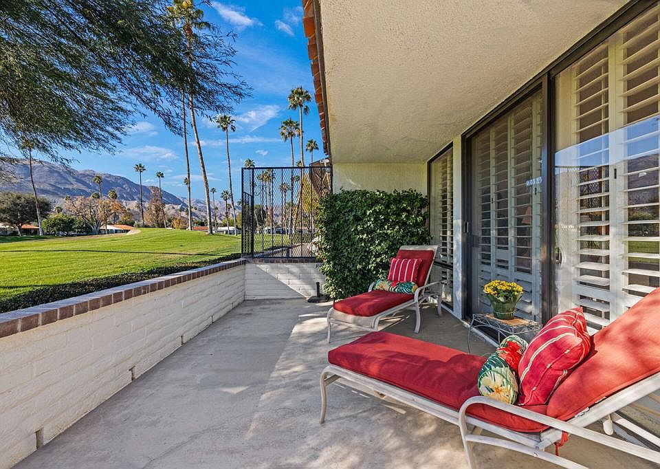Spectacular southern mountain and fairway views and a location that is steps away from the clubhouse and first tee!! This elegant 2 bedroom, 2 bath + study/den home in Rancho Las Palmas Country Club comes with vaulted ceilings and wall-to-wall windows that offer spectacular southern mountain views. The kitchen has been updated with granite slab counters, new cabinets and stainless refrigerator. The primary suite features an atrium for light and breezy outdoor access, an updated bathroom with skylight, tiled walk-in shower, cabinets and granite slab. The den/office has built-in desk and cabinets for a great remote work space. The home also has a new HVAC in 2022 and a newer water heater. Rancho Las Palmas has resort-like amenities including 27 holes of golf, 20 tennis courts, 8 pickleball courts, a fitness facility and clubhouse, and OMNI hotel affiliation. This home is an excellent investment opportunity as it has a multi-year VIP rental history. HOA fees include premium cable (Showtime and HBO), internet, and security with guard house. The home is offered turn-key furnished and ready for you to start living your relaxing desert lifestyle today!