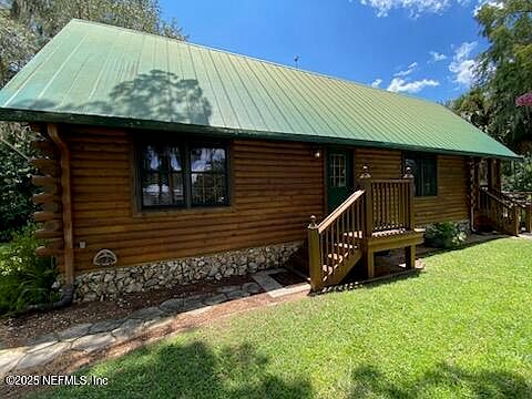 Discover rustic riverfront living in this cozy two bedroom, two bath log cabin on a canal leading directly to the Saint John's River! This charming retreat features a welcoming open layout with vaulted ceilings, a loft style second bedroom, and a 2023 AC system and heat pump for year-round comfort. Going to love the new water conditioner. Enjoy the large deck overlooking the water, a private dock with two covered boat lifts, and mature fruit trees including orange, papaya, grapefruit, and tangerine. The convenient second bath off the back porch is perfect for guests after a day of boating or fishing. Minutes by boat to Salt Springs, Silver Glen Springs, and the Ocklawaha River - ideal for fishing, shrimping, and crabbing. Ask about the boat in the pictures and make this tranquil river escape yours.