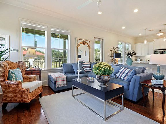 Beautiful home in gated waterfront community with only 8 houses! Perfect for weekend getaways or live year round like you are on vacation! Views of the Bay from porch. Open floor plan great for entertaining. 3 Bedrooms, 2 Full Baths. Bonus room could be used as study or additional beds. 10' ceilings, oak floors, gas range. This home also includes a storage shed, exterior lift, and well appointed outdoor kitchen & entertainment area. Property is equipped with sprinkler system, alarm system, and security cameras. Shared amenities in include large fenced yard, pool, and lighted fishing pier with designated boat slip. HOA dues cover pool & pier maintenance and all lawn care. Enjoy fishing, swimming and boating on the Bay, and ride your golf cart to Old Town!
