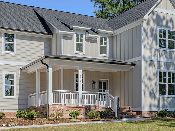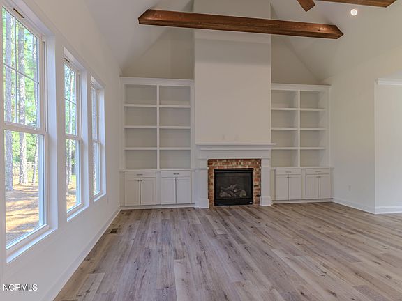 This exquisite newly constructed home is located on an extraordinary parcel overlooking Lake Auman, Seven Lakes, NC. Sitting high and dry on over a half acre at the top of Brown Ct., a serene cul-de-sac where you can catch water views and enjoy a spacious back yard and patio area. Upon entering you can't help but to appreciate the captivating vaulted ceilings adorned with exquisite exposed beams, creating a cozy and enjoyable ambiance. The propane fireplace warms the bright and inviting great room as the open floor plan flows seamlessly connecting the expansive living room, dining area, kitchen, and primary bedroom (all located on the main floor). Snowy white luxury quartz illuminates luxurious bespoke cabinetry. Kitchen features include upgraded white porcelain farm style kitchen sink, an upgraded gas range, a custom designed pantry. Thoughtful and convenient access to a beautiful back patio is already in place. A stunning primary bedroom suite located on 1st floor is beautifully adorned with fine details such as hand crafted wood finishes and Italian Carrarra marble. 2nd floor opens to a spacious mezzanine-like flex room, perfect for a home office, study or gathering areas. Throughout ample windows, vaulted and raised ceilings, built in shelving, upgraded designer finishings and paint colors, take this to home to a custom built level. True wood shelving provides both beauty and practical storage solutions, enhancing the overall aesthetic in every room and providing ample storage areas. Rich durable wood LVP flooring throughout the home (no carpeting) is the perfect choice for living in the Sandhills. Buyer will need to assume a purchase or rental account for the propane which supplies fireplace and range. Call Listing Agent for details on our Trusted Preferred Lender Program (Beneficial Buyer Program). This stunning home is under construction. Call Listing Agent to have Builder meet Buyers to discuss additional upgrades, features and his exceptional warranty!