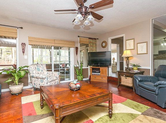 Gorgeous lakefront home with private dock and amazing water view. A large front porch welcomes you into this stunning home featuring beautiful hand scraped wood floors, massive brick fireplace, huge sunroom and covered deck overlooking the lake. The updated kitchen offers ceramic tile, solid surface countertops, large pantry and a snack bar. The oversized owners suite has a large walk-in closet, two separate vanity areas and two sinks. You will also find two additional nice sized bedrooms connected to a spacious jack and jill bath. Extra features include a large fire pit, walk-in basement storage area and shop, fenced in yard and a boardwalk to the dock. This home is a must see and wont last long with its convenient location close to I-20, a short commute everything and 100% financing with no city taxes! .