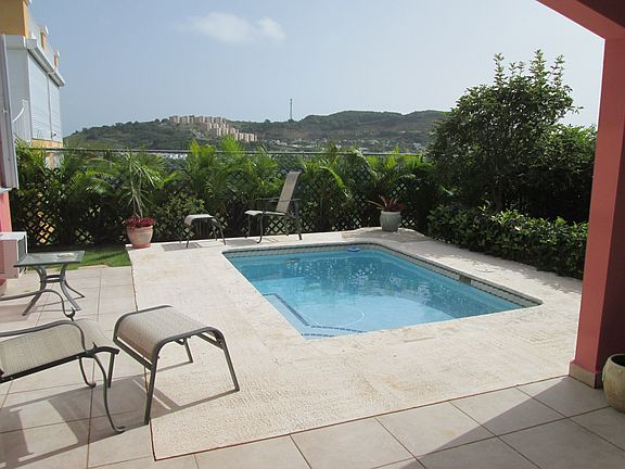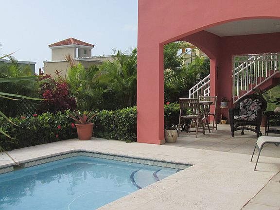 This home, located above Puerto del Rey, the largest marina in the Caribbean, and the developing Roosevelt Roads Naval Base, has an unusual design. We enter on the living level with a beautiful view of the islands of Culebra and Vieques in front of us. The bedrooms are downstairs with access to the pool, the garden, and the patio. The living level is open plan, airy, spacious, bright, with ocean breezes at all times. The 15 x 17 ft balcony with awning is off the dining room, with easy access from the kitchen. An outside staircase leads to the pool and patio below. Deposit requires $1400 plus first month's rent. Owner pays HOA fees. Renter pays utilities. Two-year lease preferred and/or option-to-buy available.