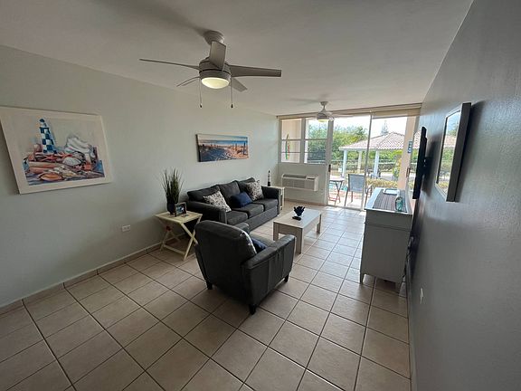 Hard to find 2 bedroom 2 bath unit of 1,006 sq. ft. at Sea Beach Village, a desirable property located just off a beautiful sandy beach in Rincon. This first floor unit overlooks the pool and has easy access as well. All furniture included with the sale This condominium has a very open layout with the kitchen and living room attached. The kitchen has stainless appliances and an updated quartz counter top. There are air conditioning units in all bedrooms and the living area as well as an apartment sized washer and dryer. Has patio off the living room sliding door just above the pool area. Sea Beach Village has a large pool area and patio, with covered space and an indoor clubhouse as well as secure access and backup generator. This unit offers a double parking space. Beach access is along a trail near the canal that runs next to the property and Rincon Plaza, restaurants, grocery are all within a short walk. Short term rentals are allowed. HOA dues are $187/month.