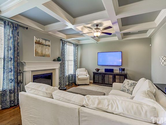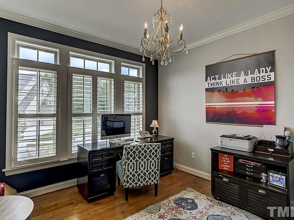MUST SEE upgraded cul de sac stunner w 3 car garage in sought-after Amberly, near RTP, UNC/Duke, I-540. Screen prch w western sunset + wood burning fireplace on pool worthy flat b-yard. Kitchen opens to living rm w coffered ceiling. Office w wood shelves. 2nd fl hwds in hall, laundry w sink, built in desks in loft, huge master w den, 2 bdrms w playrms. Murals painted by famed J Woods. 3rd fl suite w full bath + 2 bdrms, perfect for teens, guests. Gorgeous home, won't last long. $2K carpet/paint allowance!