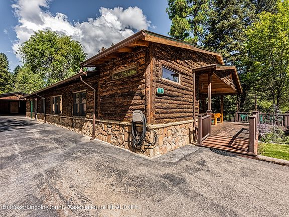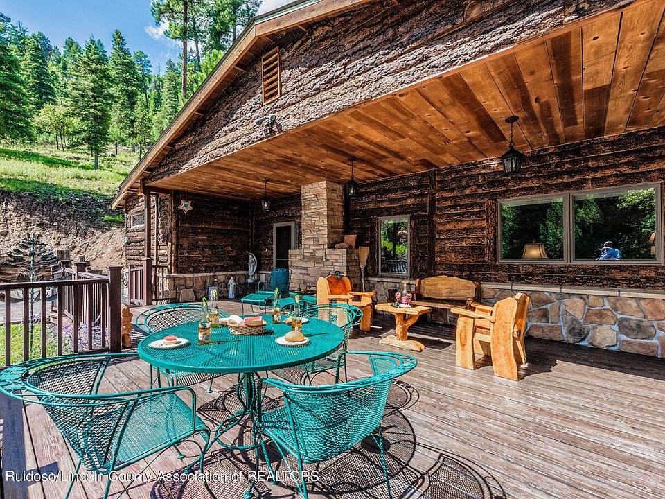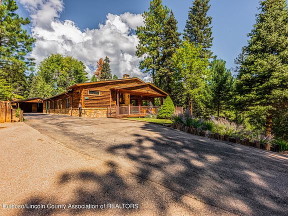 Upper Canyon Utopia! Absolutely stunning 2400 square foot cabin on 4 acres in the ever-popular Upper Canyon. This 3 BR/3 BA home has been updated and has new additional living space along with new subflooring, flooring, new windows, decking, etc. Nestled in a quiet, somewhat hidden area this home still has its Ruidoso rustic charm with bark-on log siding, pine paneling, wood beams and wood flooring. This home has been lovingly cared for and is in excellent condition. Original fireplace has been converted to gas, refrigerated air, custom wood doors, trex and wood decks, granite counters ,leaded glass doors/accents, paved parking, carport and flagstone patio. Covered and uncovered east viewing deck for watching the abundant wildlife. City water/septic. This is the complete package.