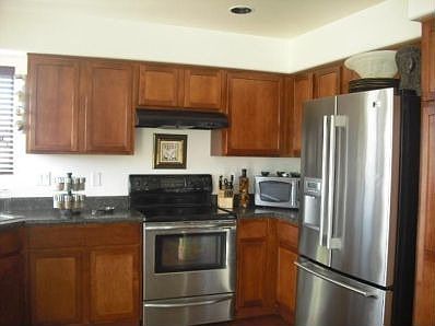 Beautiful home with wood floor, dark wood cabinets, shows clean like a model home!