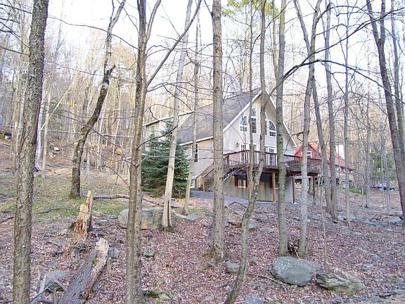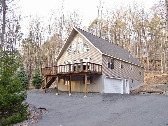 This 9 year young contemporary chalet located in the prestigious Tanglwood Lakes Community offers lake rights to Lake Wallenpaupack and features an open concept floor plan with a spacious living area, dining area and modern kitchen with stainless steel appliances & island. The great room is tastefully appointed with a cathedral ceiling with T & G, hardwood floors, an abundance of natural light and a beautiful floor to ceiling stone fireplace creating a warm ambiance when entertaining. There are 5 bedrooms including 2 master suites, 4 baths, finished lower level family room, spacious deck for outdoor entertaining and a 2 car garage. This is a must see property as there are just too many upgrades to mention. Call today for a private showing of this spectacular property.