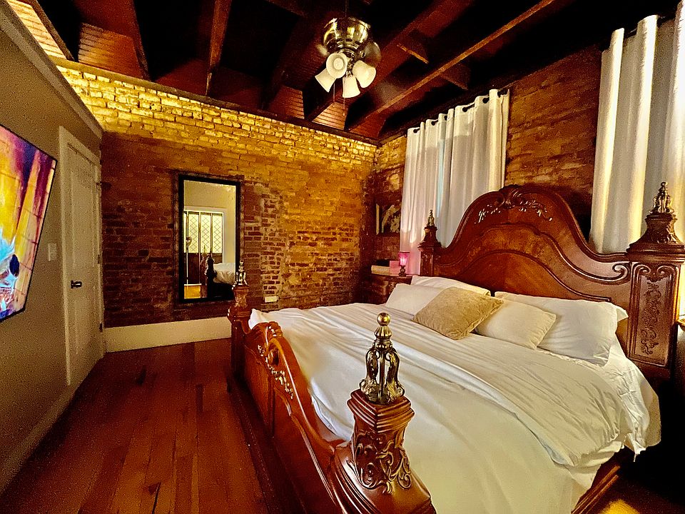The loft features vaulted ceilings with antique beams, exposed brick, hardwood floors, a queen bedroom with an antique bed, a queen pull-out sofa, a full kitchen with dining area, central heat and air, washer and dryer, and two flat-screen TVs (65" in the living room and 46" in the bedroom).