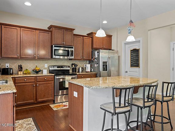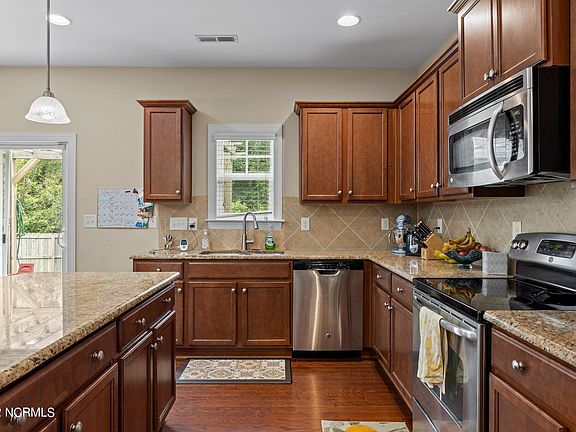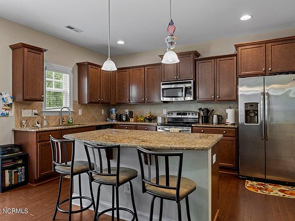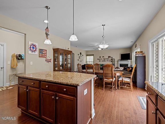 Sensational home in Swansboro! Right down the road from Hammocks Beach State Park and more! This four-bedroom, 3.5-bath, and 3rd-floor bonus room have it all! Walk into the large foyer with beautiful hardwood floors—formal dining lined with archways and impressive coffered ceilings. The home has blinds throughout. Open floor plan, the living room is large with a gas fireplace. The kitchen area is spacious, with granite countertops. Stainless steel appliances. Walk-in pantry! Mud room off the kitchen to the garage. Tons of storage! Walk up to the 2nd floor to a large principal suite, master bath with walk-in shower and tub, water closet, and walk-in closet. 2nd and 3rd bedrooms with walk-in closets, 4th bedroom is enormous! Walk up to the 3rd floor to the huge bonus room and full bathroom.