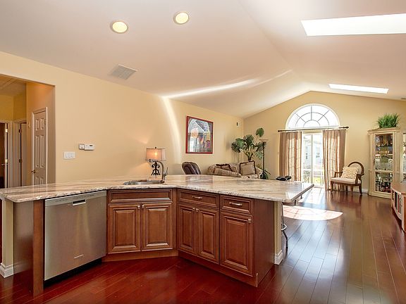 Raphael Model in 55+ community. Front door leads to are vaulted ceiling & gleaming Mahogany floors . The living/dining rooms are spacious. The new kitchen has stainless steel appliances and granite counters. Open floor plan with skylights. Master suite with 2 closets.