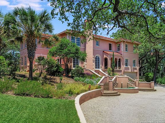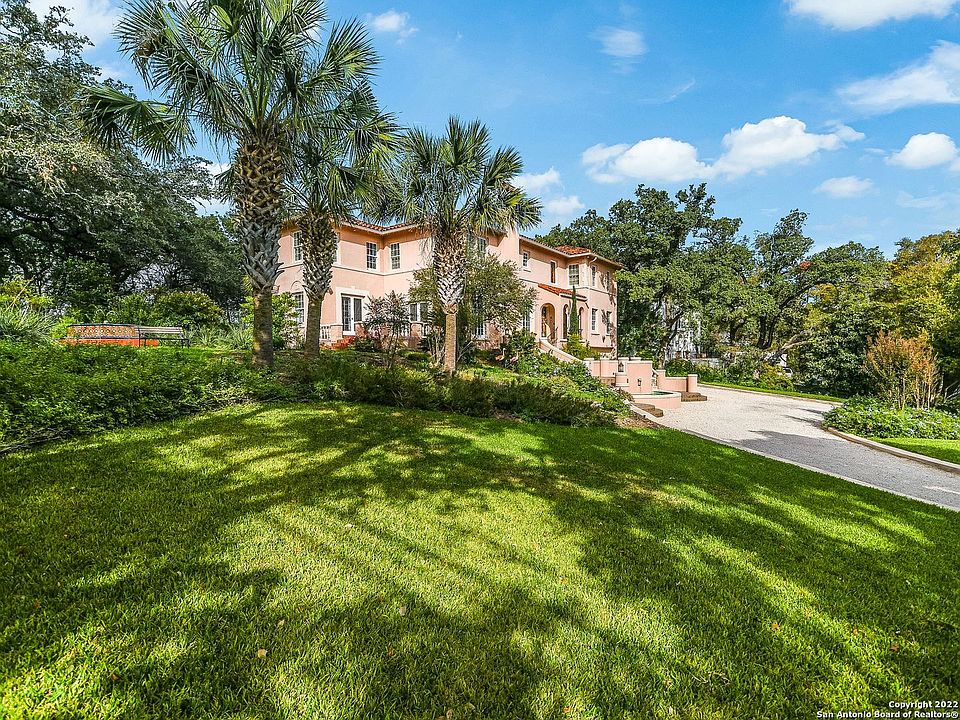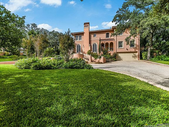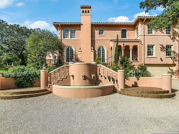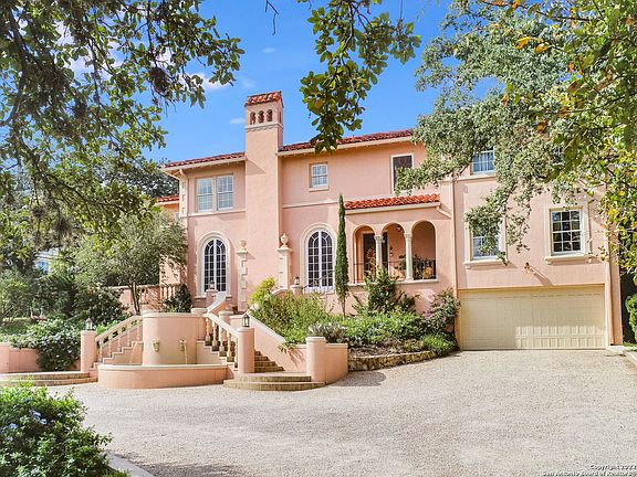A gentle crest within walled and gated grounds emphasizes the classic architecture of this 1930s estate rimmed with lush landscaping. Period glamour begins with a parking court edged with a dual entrance staircase wrapping around a fountain and ascending to an entrance punctuated with archways and columns. Sculptural stucco ceilings and doorways, pegged wood floors, and a tiered, iron-embellished staircase offer a fitting entrance to the finely restored interior that doesn't stray far from its original charm. The foyer classically separates the sunlit living room with Italianate fireplace surround and arched windows paired with French doors to the outdoors. Banquet dining is off the other side, plus has easy access to the gathering kitchen for occasions. Work and play come together with a crisply tiled library and card room with wet bar and fireplace, plus a separate adjoining home office. The kitchen has been opened and expanded to encourage gathering with a columned dining island as well as a freshly decorated, sunlit breakfast spot and a Redondo tiled conversation area. Color-washed cabinetry integrates a gas cooktop and custom front SubZero, with glass front cabinetry for display. Nearby French doors invite you out to a loggia with exposed beams and fans, for al fresco dining across views of the tiled pool, while a Redondo tiled terrace adds chic entertainment space under the palm trees and shady large oaks. Upstairs, grand bedrooms offer privacy with personal space including a master bedroom with a sitting area, and a second bedroom with a Juliet balcony overlooking the grounds. Two other bedrooms, equally spacious, suit your needs with ease. The four unique baths offer the magic of the era with tiled wainscot and mosaic floors plus a touch of vintage fixtures. At the lower parking level is a basement home gym, with an outdoor view. Conveniently located close to The Pearl, Zoo, and Brackenridge Park.