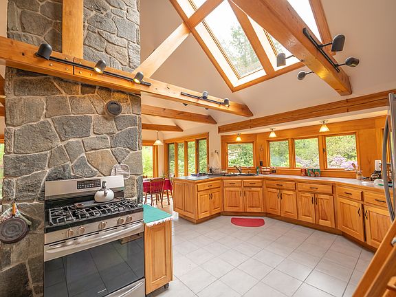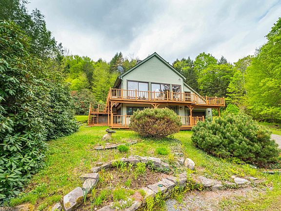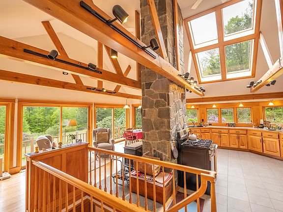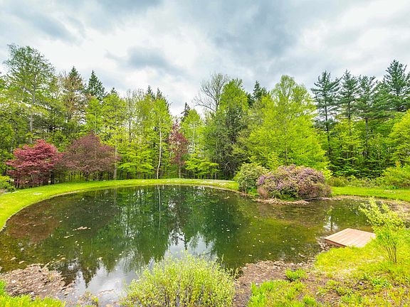 Lovely custom home just outside the town of Dover, near the Mount Snow ski resort and village of Wilmington, and near Lake Whitingham, with easy access near a paved town road. This cozy Vermont retreat sits on 14+ acres with established walking trails, a large pond, perennial landscaping, gorgeous stone walls, and more. The custom home is being offered by the original owners and features a large open concept floor plan with lovely vaulted living room with exposed natural wood beams, a floor to ceiling stone chimney with wood stove on each floor, great natural light and exposed woodwork, a spacious dining area, expansive kitchen with stainless appliances and bay window out to the landscaping, main floor primary suite with upgraded full bath and tiled shower, as well as walk in closet and den, a tv area off the main living room which could serve as an additional sleeping space, an upstairs cozy loft space, a lower level family room with kitchenette, large bedroom, second updated bath, laundry, and mudroom with ample storage for gear, off the attached garage with more storage. There are also less obvious beautiful custom wooden built ins throughout, a unique ladder staircase to the loft, and a wraparound deck. Finally there is a 2 story detached garage with full upper storage area and walk around upstairs access. A perfect Vermont escape for anyone looking for easy access but all the features a Vermont home should offer.