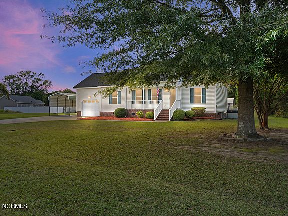 When you step inside this home, it is obvious that it has been loved and meticulously maintained by its owner. With fresh paint throughout, this 3 bedroom and 2 bathroom home offers a split floor plan. The living room is the heart of the home with vaulted ceilings and a fireplace with gas logs. The all white, galley style kitchen includes all appliances and overlooks the spacious backyard. The primary bedroom features 2 closets and an en suite bathroom. In addition to the attached 1 car garage, these is a detached carport. Situated on .8 acres, a portion of the backyard is fenced in, there is also a spacious storage shed and a covered deck. Some of the improvements made include: roof replaced in 2020, hot water heater and paint 2024, HVAC 2018 and carport with cement 2022, shed 2016, some flooring 2020. Located a short distance from interstate 42, HWY 70, 581, SJAFB and Goldsboro.