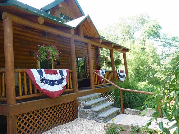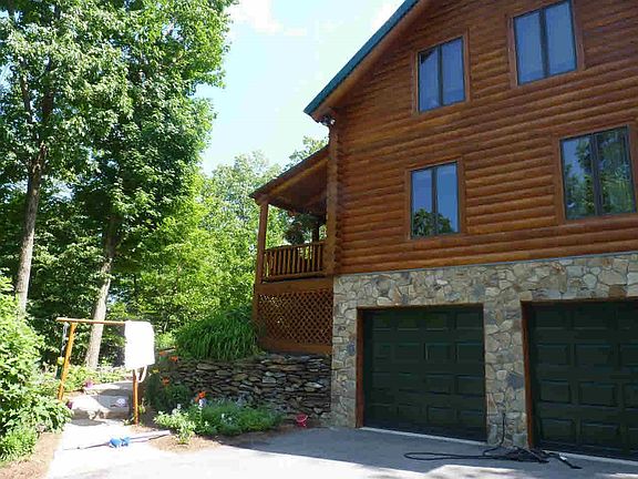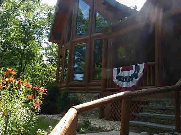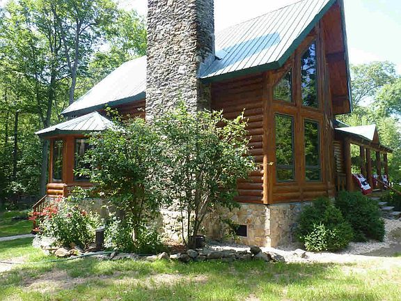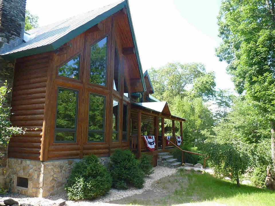This stunning log home sits on 11+ acres of pure privacy. Sit out on your E. facing front porch for your morning coffee and BBQ on your Blue Stone patio in the evening. Then head inside to enjoy your open space LR with a floor to ceiling stone FP with a wood stove, dining area, updated EIK with stainless steel appliances and granite countertops, full BTH and 2 BDRMS. The 2nd floor consists a private den, large storage closet and a Master Suite which offers 2 California Closets, a spa shower and large jacuzzi. Basement has pumbing for 3rd BTH.