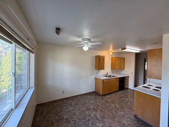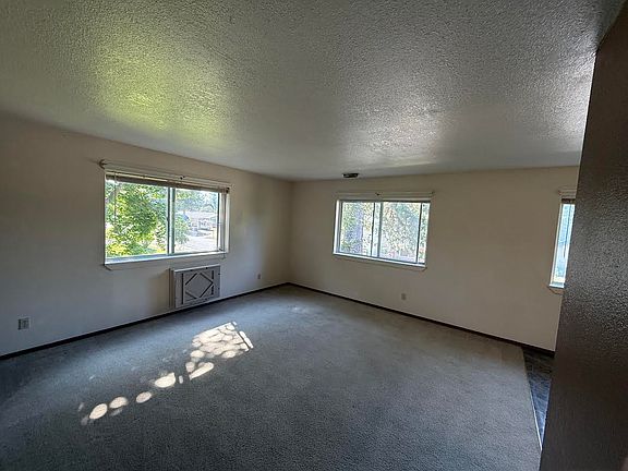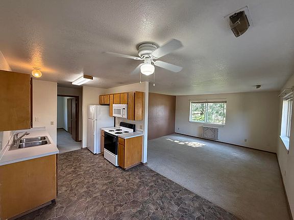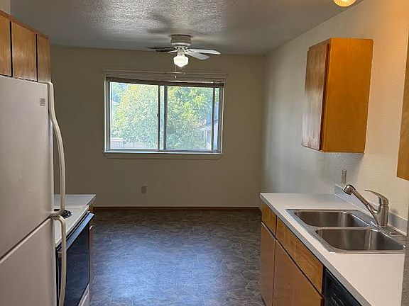 Two bedroom one bath four-plex in Post Falls. Home has a single car detached garage, wall A/C unit, appliances include fridge, range/oven, dishwasher, and washer/dryer hookups. Home has laminate flooring, back deck, and is available for showing now. Includes lawn care, wireless internet,