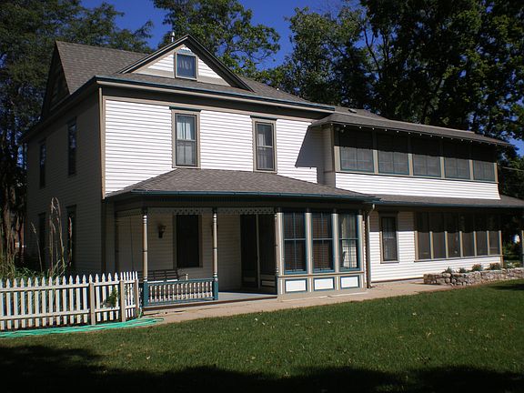 Lovely folk victorian home on a corner lot adjacent to downtown Halstead. Main floor consists of formal living room, formal dining room, office/den, family room, eat-in kitchen, large laundry room and a half bath. The second floor has a large master bedroom with master bath and large walk-in closet and dressing room. Two other large bedrooms, a full bathroom, landing nook and door to front balcony complete the second floor. The fourth bedroom is a third floor converted attic complete with egress window and closet. Porches include the main level 'side porch', a large screened porch off the kitchen and a large sleeping porch off the second floor hallway. There is a detached two-car garage and a 400 s.f. heated/airconditioned workshop directly off the fish pond garden. Official size of the lot is 18,000 s.f., but because of the corner lot and property set-backs in Halstead, the effective lot size is 26,000+ s.f.