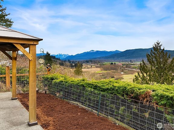 Sweeping mountain and valley views, main level living, quiet street location just minutes from downtown Monroe! This well-maintained four-bedroom, two-bathroom home boasts new carpeting, paint and hardwood flooring throughout. Spacious living room is bright and open complete with skylight and cozy free-standing gas stove. Beautiful kitchen features 19th century style Heartland six-burner gas stove and warming tray. Separate dining room with ample space for all your social gatherings. Large primary bedroom with three closets and primary bathroom. Exterior boasts professional landscaping and oversized detached 1-car garage with power and sufficient room for a large shop. Two utility outbuildings, both with power and concrete flooring provide plenty of dry storage; the larger of which contains a work bench, shelving and an extra fridge + separate freezer. NEWER ROOF, forced-air gas heating, RV parking, gazebo and fenced back yard add to the tremendous value of this lovely home.