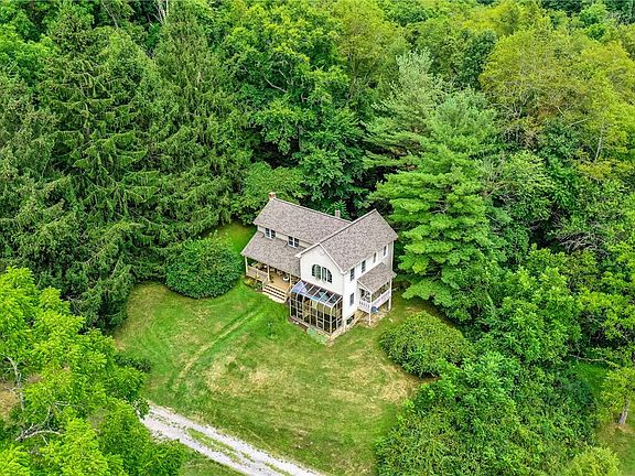59.5 Acre private wooded hideaway nestled in the valleys and hills of The County Greene. The circa 1880 farmhouse has been thoughtfully updated and expanded over the years, doubling the original home's size while maintaining its authentic charms. In addition to a new boiler (2022), roof and restored front porch (2021), the entire foundation has been rebuilt and the basement lowered, allowing for plenty of dry storage and a 460-square-foot room wired, framed, and waiting for your finishing touches. The circa 1880 barn, a 1320-square-foot structure features exposed hand-hewn beams, a newer foundation, and a newer roof. It is currently home to a pottery studio but would lend itself well to be finished as second living quarters or event space. + additional 323 sq. ft. shop/storage and 140 sq. ft. shed. Enjoy your walks along the meandering stream and extensive nature paths, and don't forget the trees, Walnuts, Oaks, Maples, and Beechs abound.