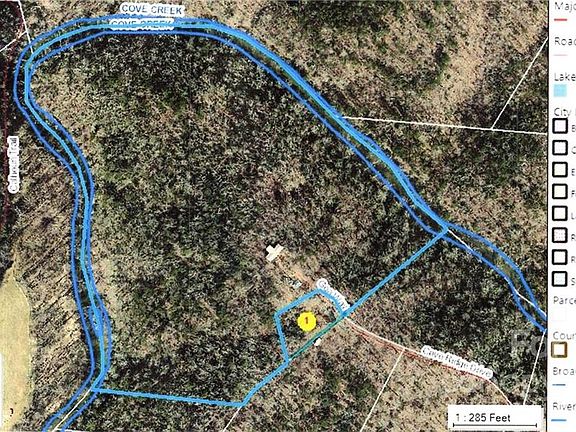 VERY UNIQUE 28.11 WOODED ACRES! 2,940 FEET OF FRONTAGE ON BIG, BOLD COVE CREEK! Lovingly named HORSESHOE HILL by the owners, this 28.11-acre parcel is an old growth hardwood forest, with many huge oak trees with Cove Creek for its border and one access, making it very private homestead! ATV/walking trails throughout, abundant wildlife, fenced garden area, rustic barn & tractor hut. The owners built the guest cottage first to live while they built their log home, but it ended up being their primary residence. The rustic 2-bdrm cottage has Hemlock siding & a big front porch, open kitchen/living/dining, master w/walk-in closet, 1 full bath, 2nd-BD w/closet, laundry room. The log home is a "dried-in shell" -"handyman-special"(No electrical/No plumbing -1336 sq. ft) on a full walk-out basement w/stubbed plumbing for another bath. The floor plan called for open kitchen/living/dining, master suite w/full bath;2nd bdrm;2nd bath; a loft. Just minutes to Lake Lure!