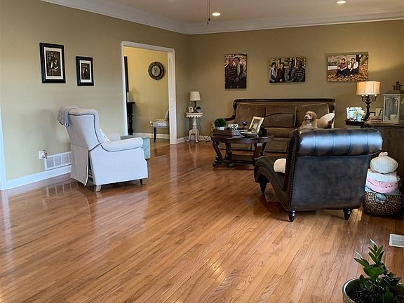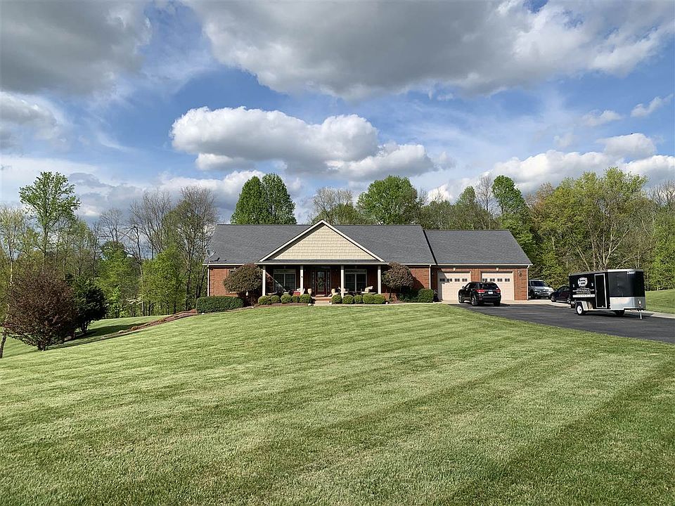 Beautiful custom brick ranch on almost 2 acres at the end of a cul-de-sac. With over 2,000 sq/ft on the main floor, the rooms offer great space and function with a great layout. Hardwood extends in the living room, hallway, and master suite. Gorgeous customs cabinets in the kitchen with granite countertops and tile backsplash/flooring. Enough room for 4-5 barstools around the large bar, plus room for an eat-in table. The space is joined to the formal dining area. Sliding glass doors take you outside to enjoy the stunning tree-lines backyard. The property extends into the woods and backs up to a creek. The master suite offers a 5-piece bath with 2 sinks, separate tub/shower, and walk-in closet. The 9' ceilings are complemented with extra-tall crown molding on both the main floor and basement! This basement is perfect for families who love to entertain. Spacious family room with fireplace, office, rec room, bar/kitchen area with full refrigerator, large bedroom, full bathroom, and large storage room completes this level. This is the one you have been waiting for! Be sure to request a showing soon...
