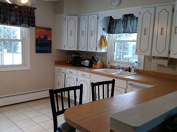 This home is located in the McMahan School District with easy access to both the Lewiston and Sabattus turnpike exits. The house has two bedrooms on the first floor with a full bathroom, that includes a double sink. The basement, is finished, and has two resting rooms and a 3/4 bathroom. The home features a large outside deck and a two car detached garage. In 2014, a new boiler was installed and connected to natural gas. Also, for a second source of heat, there is a wood/coal stove in the basement. The house does come with all of the appliances in the kitchen and the washer and dryer in the basement.
