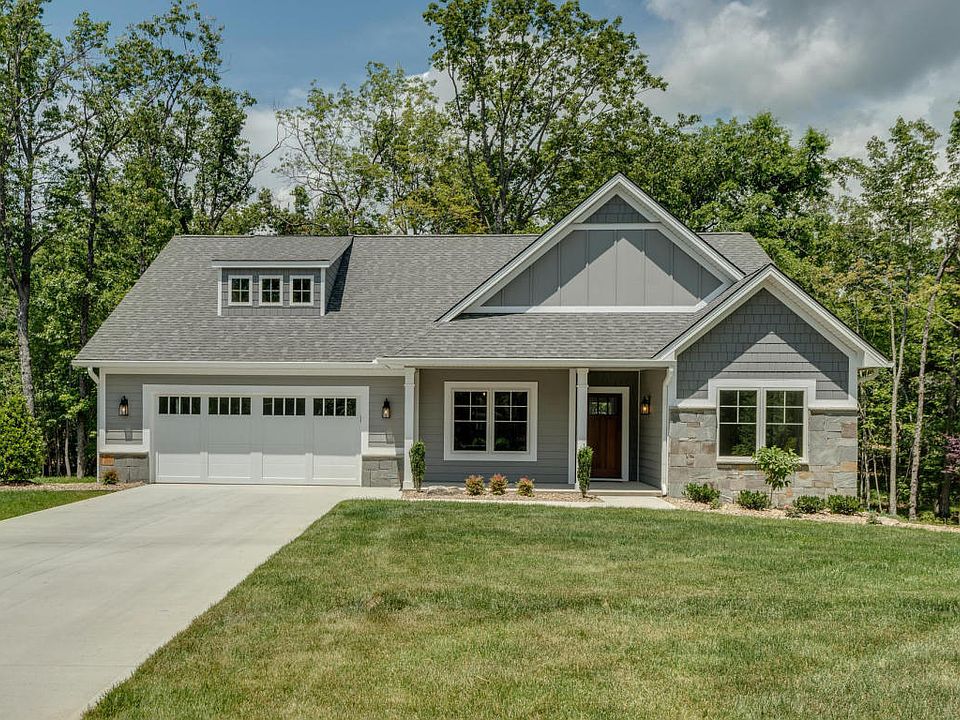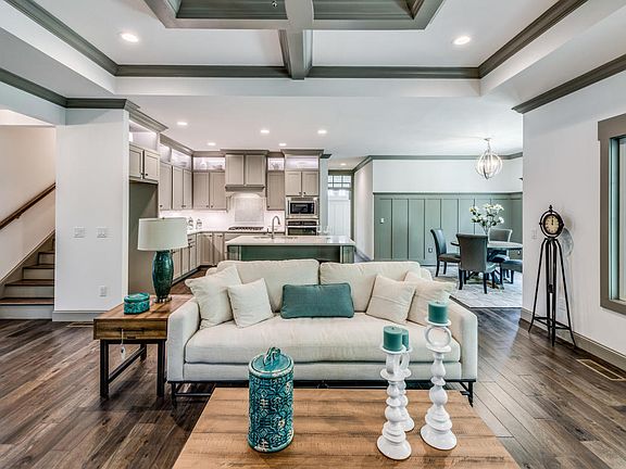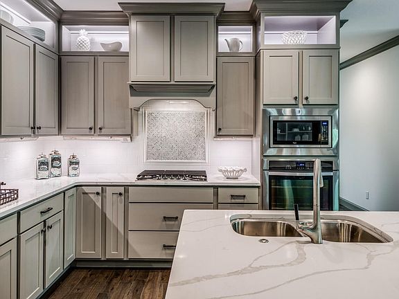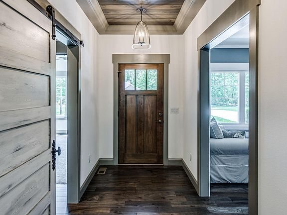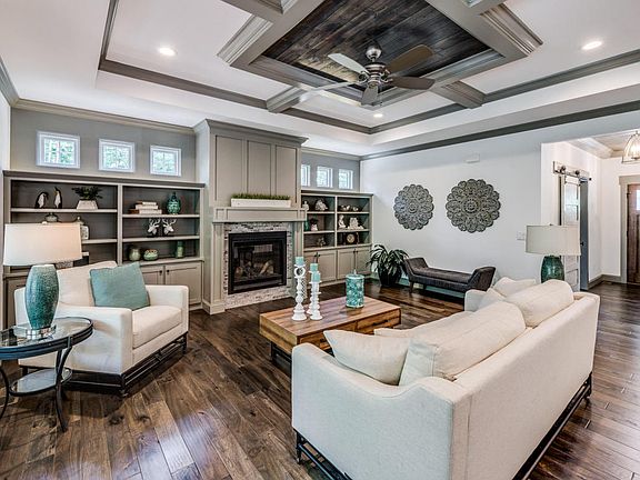 This craftsman style home was inspired by many of the trendiest designs currently featured on HGTV with a farmhouse chic influence detected throughout. Features grey cabinets, wood floors, an antique style barn door, shiplap wall accents, corrugated metal accents, wood-look tile floors, coffered ceilings with beautiful crown molding and wood accents, board and batten wall accents, open lighted cabinets above the main cabinets in the kitchen, Adorne under cabinet electrical system, tile backsplash, built in bookcases around the fireplace, quartz and granite countertops, custom closet shelving in the master and walk-in pantry, Hardi Siding, real stone from local quarries on the exterior, carriage style garage door, Trex decking, Afco deck rails. Fairfield Homes proudly uses Andersen windows!