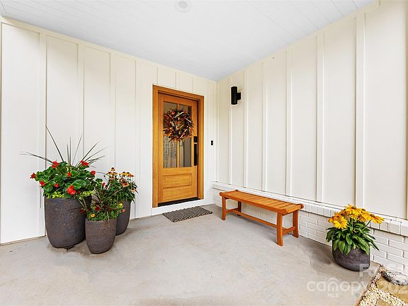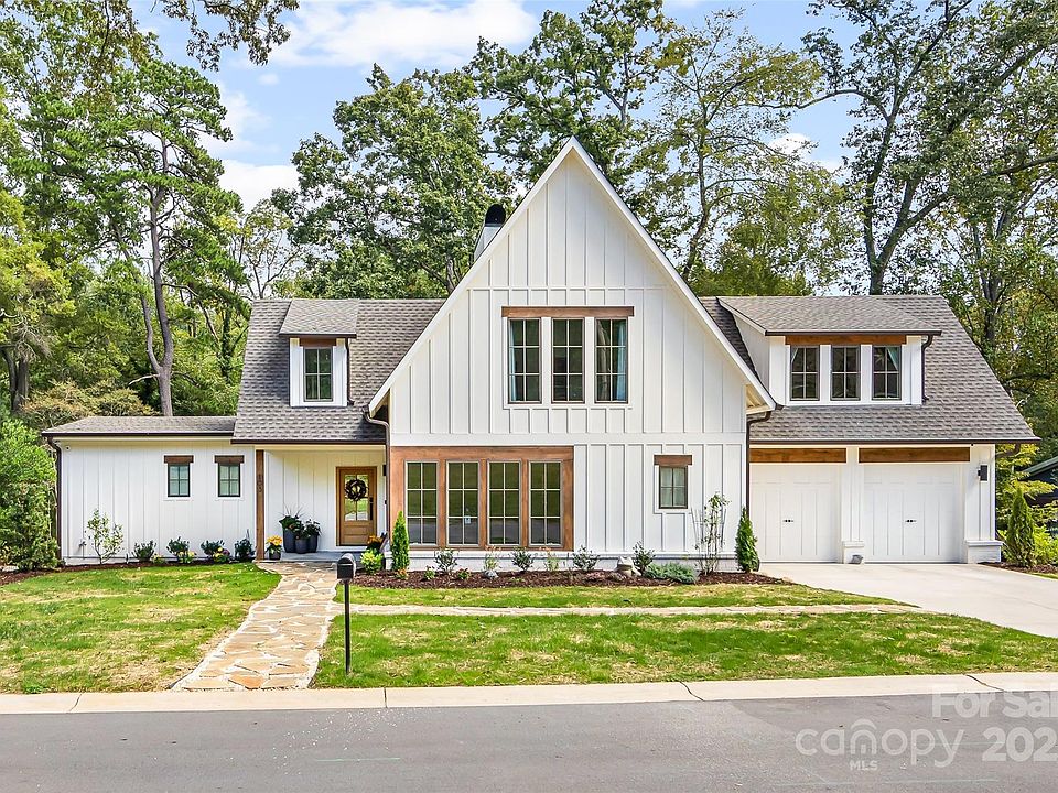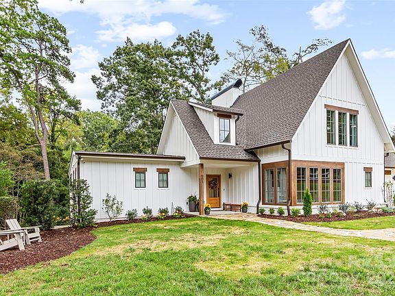 Beautiful, fully renovated mid-century modern basement home one block from restaurants, Summit Coffee, Main Street Books and other shops on Main Street Davidson. The property is .44 acres and is a 5 minute walk to the Davidson College campus. The comfortable home is filled with light from the large windows and has wonderful views of the beautiful woods behind the property. The house renovation was designed by local architect, Nicole Perri, and underwent a complete remodel including significant additions. Despite the extensive changes, the original structure of the home was preserved. Beyond the original foundation and studs, every other aspect of the home is brand new. This includes a complete overhaul of the electrical system, with new wiring throughout and installation of underground power lines. All plumbing has been replaced, including plumbing pipes leading out to the street, ensuring modern reliability. The renovation process was highly hands-on, with the owners involved in every decision. From selecting windows and flooring to choosing doorknobs, their meticulous attention to detail is evident throughout the home. The owners even took special care to preserve the wood from a beautiful large red oak that had to be removed from the property and utilized it as hardwood floors and stairs in the home. The result is an absolutely fantastic residence, where every feature has been thoughtfully considered and executed. The home has 5 bedrooms, each with its own bath. The primary bedroom with en suite bathroom is on the main level along with a large great room that is open to a spacious kitchen and dining room, scullery, laundry room, drop zone, office/den and large partially covered deck. Upstairs there is a loft, two more large bedrooms and two en-suite bathrooms. The basement offers an entire separate living space with two bedrooms, two en-suite bathrooms, large family room with wet bar, kitchenette and dining/den area. There is ample storage in the basement with over 460 square feet of partially finished/heated space and another 107 square feet of unfinished space. Walk out of the basement to a large covered patio and two additional patio spaces. Yard has been landscaped and new lawn seeded after completion of all construction. Two-car attached garage with wiring for electric vehicle chargers. Additional concrete parking area to the right of driveway.