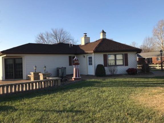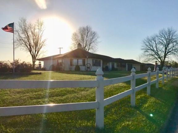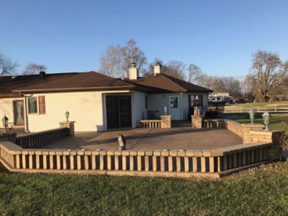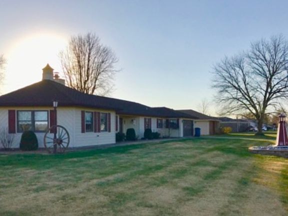 This sprawling 3-4 bedroom, 3 bath ranch home has been meticulously maintained and is move in ready. The impressive double entry doors lead to the living room with a beautiful fireplace and a vaulted, wood-beamed ceiling. The all white kitchen has an island with slide in range and is open to the dining space. The second living area is spacious and has French doors leading to a beautiful outdoor patio and gazebo. The master bedroom has its own en suite and is on the opposite end of the home from the other bedrooms. There are 2-3 additional bedrooms, 2 of which have large walk-in closets, and 2 additional full guest bathrooms. There is an attached 2 car garage, 12 x 16 yard barn with electric, outdoor patios, and a back yard gazebo on the property. It is situated on 2 large lots at the edge of town with a farm view in the backyard.