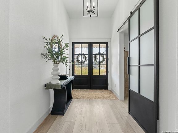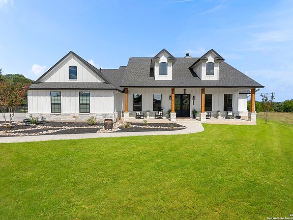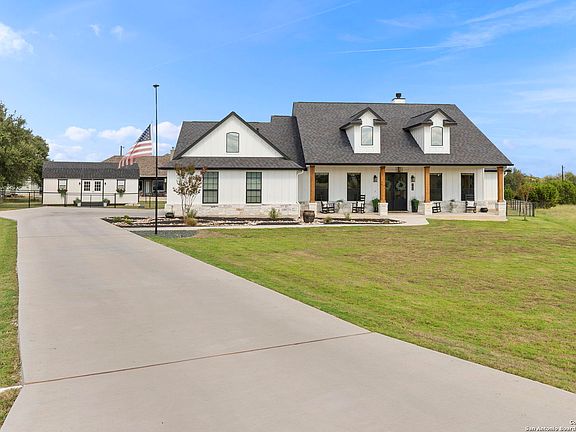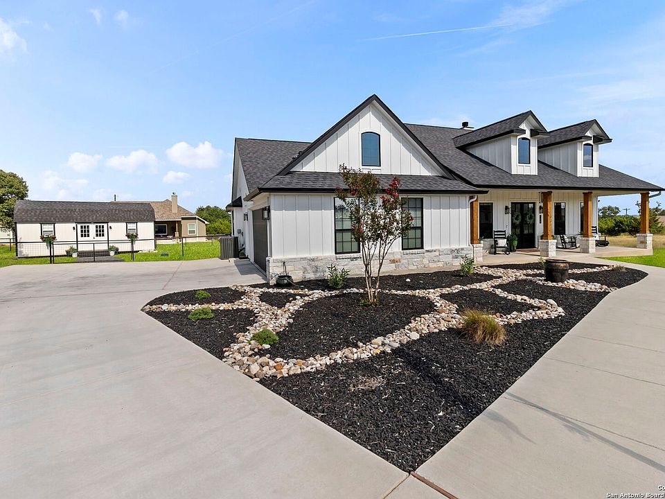 Welcome to a beautifully crafted 4 bed, 3 bath home by Sierra Classic Homes, offering luxury upgrades and modern efficiency in one of the Hill Country's most desirable golf communities. Inside, you'll find an open layout with soaring 10' vaulted ceilings, quartz countertops, custom maple cabinetry with pull-out shelving, high-end Gen Air appliances, and hand-scraped luxury vinyl plank floors. The spacious primary suite features two closets (one with custom built-ins), a soaking tub, and a separate shower. Additional highlights include a dedicated home office, smart thermostat, Ring doorbell, built-in speakers, electric shades, oversized AC unit, and tankless water heater. Outdoor living is just as impressive, with a covered patio wired for TV, ceiling fans, and built-in speakers. The property also features a fully insulated 28x14x14 shed with A/C and heat, keypad entry, and its own breaker-perfect for a workshop, studio, or hobby space. A full irrigation system, oversized garage, and fenced yard complete the package. Living at Rockin J Ranch means access to a community pool, walking trails, pavilion, and the championship Vaaler Creek Golf Club-plus 3 free rounds of golf each month. Conveniently located just 1 hour from both San Antonio and Austin airports, and close to the Fredericksburg wine trail, this home offers the perfect blend of Hill Country charm, resort-style amenities, and everyday convenience.