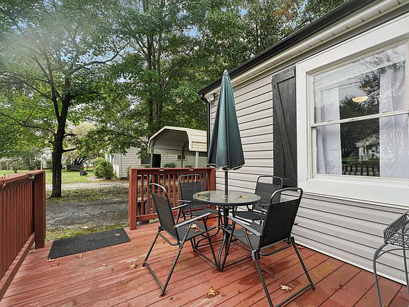 This super cute Ranch home is the perfect combination of vintage charm and thoughtful updates with fresh interior paint, new drywall, newer windows, and a new HVAC system. The water heater and vinyl siding are just 5 years young, ensuring peace of mind for years to come. Step onto the spacious front deck, ideal for relaxing with a table and chairs or rocking chairs to take in the peaceful surroundings. Inside, you'll find hardwood floors throughout, adding warmth and character to the entire home. The Family Room is an inviting space and features a stunning accent wall serving as its focal point. The Kitchen retains its original cabinets with the addition of a newer range and a brand-new refrigerator. The stylish tile backsplash, decorative tile accent wall, and a convenient free-standing island make the kitchen as functional as it is charming. Two bedrooms share a recently updated full bath. A newly added Laundry Room complete with a washer and dryer adds practicality to the layout. Outside, the tree-lined backyard offers privacy, a small patio area for outdoor enjoyment, and a lovely spot to relax or entertain.