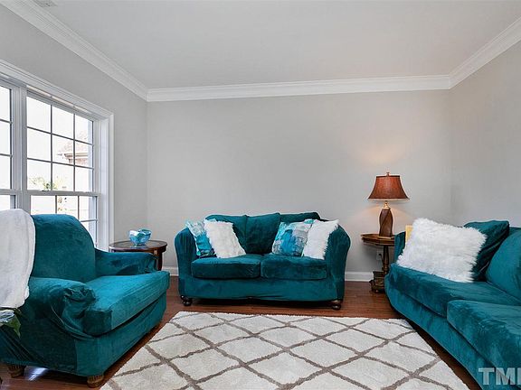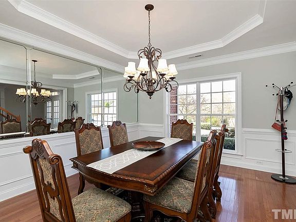 Stunning Carramore 5 bed / 4 bath cul de sac home. Spacious dining rm w/mirrored wall. Huge kitchen w/oversized isle, dbl ovens, tons of cabinets. Huge familm has gas log FP. 1st flr bedrm. Gleaming hardwoods on 1st & 2nd floors. Master bed features trey ceiling, sitting room. Huge master bath w/ large walk-in closet. Spacious bonus & 3 secondary bedrooms complete the 2nd floor. 2 story entry. Light / bright home. Freshly painted interior. Roof 2019. Great schools, close to RTP, RDU, shopping & dining.