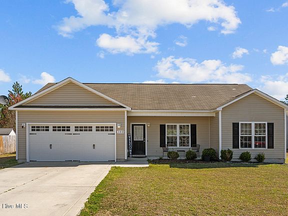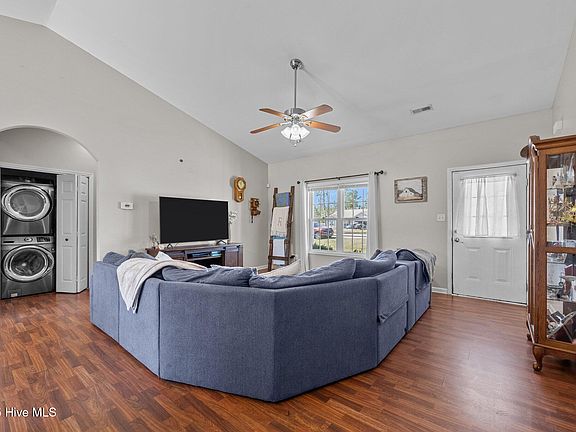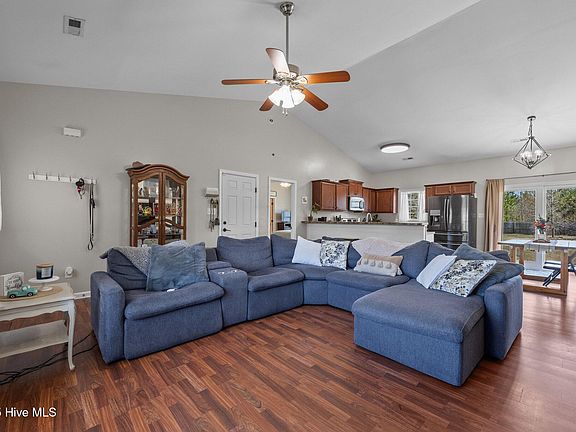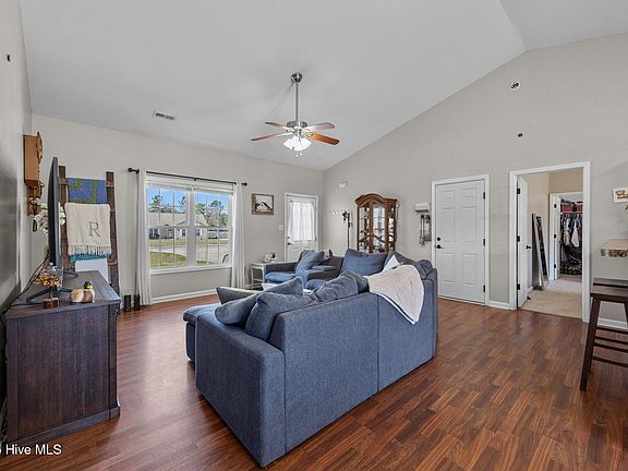 Step inside to a spacious living room with vaulted ceilings, creating an open and airy feel. The large kitchen features extra cabinet space, perfect for storage and organization. The primary suite includes a private bathroom, while two additional bedrooms provide plenty of space for family, guests, or a home office.