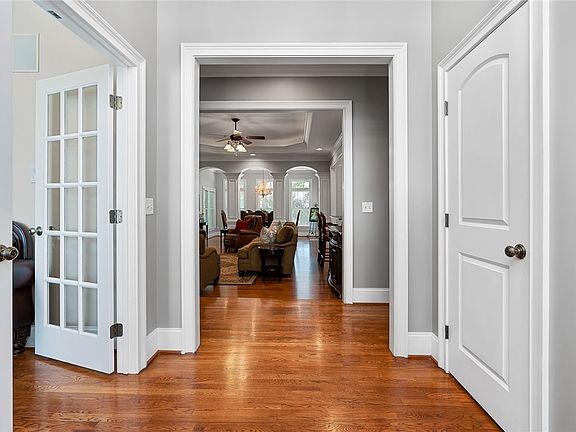 Step into this stunning luxury estate, a masterpiece of modern design and timeless elegance. Nestled in highly sought-after Rivendell Subdivision, this residence offers nearly 4000 square feet of meticulously crafted living space, featuring 6 bedrooms, 3.5 bathrooms, and a host of upscale amenities. The grand entrance welcomes you into an open-concept floor plan, bathed in natural light from floor-to-ceiling windows. The gourmet kitchen, a chef’s dream, boasts top-of-the-line appliances, custom cabinetry, and a spacious island perfect for entertaining. The living and dining areas flow seamlessly, showcasing sleek hardwood floors, a stone fireplace, and access to a private outdoor oasis. Retreat to the opulent master suite on the main level with a spa-like bathroom and walk-in closets. The additional 5 bedrooms are generously sized and situated away from the master giving plenty of privacy. The fantastic home theater is ideal for family movie nights or invite your friends over for a fantastic place to watch the game! There is absolutely no wasted space, with a formal dining, office, living room, sunroom, breakfast area, and storage galore! This home offers the ultimate blend of luxury, privacy, and style, making it an unparalleled living experience