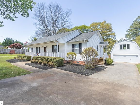 Discover the perfect blend of functionality and charm at 103 Linda Lane, Easley—a well-maintained 3-bedroom, 2-bath home that's truly move-in ready. This property boasts a standout feature: a massive 22x30 detached 2-car garage complete with a 6x7 golf cart/mower garage. Above the garage, you'll find an unfinished 14x24 rec room with large windows and electricity—imagine transforming this space into your personal gym, art studio, or extra storage area. Adjacent to the garage is an 11x22 lean-to AND a 12x12 outdoor storage building, ensuring ample room for all your hobbies and tools. Step onto the end-to-end front porch and through the foyer with elegant parquet flooring, leading you into a spacious formal dining room that seamlessly connects to a well-appointed kitchen. This space is a cozy heart of the home with an additional breakfast area by a bay window offering sunny and private backyard views. It flows effortlessly into a living room anchored by a stunning French-inspired fireplace with a stone surround and warm wide-plank wood flooring. The primary bedroom is a retreat with an updated bathroom featuring a dove gray vanity and marble countertops. Two additional bedrooms share another updated full bathroom, equipped with a barn-door vanity and modern farmhouse accents. The home also includes practical amenities like a walk-in closet and a dedicated walk-in laundry room. Outside, the large backyard is framed by fencing on 2 sides and shaded by neighboring trees, creating a private setting for the back deck. The concrete driveway includes an extra pad for guest parking, adding to the thoughtful touches throughout this home. Located just off Hwy 8 near Ingles, your new home is centrally positioned near Downtown Easley shopping and dining, with easy access to both Greenville and Clemson. This unique property, with its abundant storage options and potential for personalization, is waiting for you to make it your own.